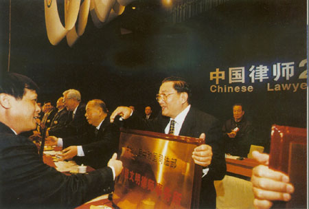 2001年律師大會中央政法委書記羅干將“部級文明律師事務(wù)所”牌授予開物律師事務(wù)所